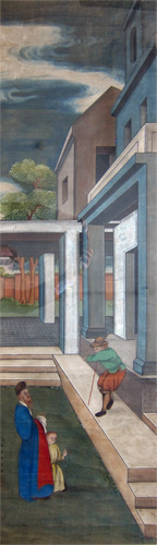 A vertical scroll executed by a Chinese artist based on one or more European engravings. Over a background best described as a perspective view of European buildings stylized in a Chinese manner, are inserted a tall figure dressed in blue, possibly a priest, with a child holding a rosary and a shepherd leaning against his staff, obviously removed from a more bucolic original context. In the17th and 18th centuries, when various European artists, namely Jesuit priests, were present in the Imperial Court, and European images became available, some Chinese painters painted European scenes or adaptations of European subjects, as the present example. These paintings must have had a novelty value for their local patrons as “chinoiserie” images had for the Europeans of the period. |