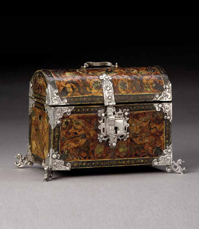 Small domed top casket with silver fittings. All the visible surfaces of the casket are decorated with attractive naturalistic scenes rendered in “Berniz de Pasto”.